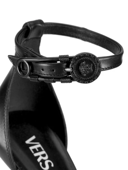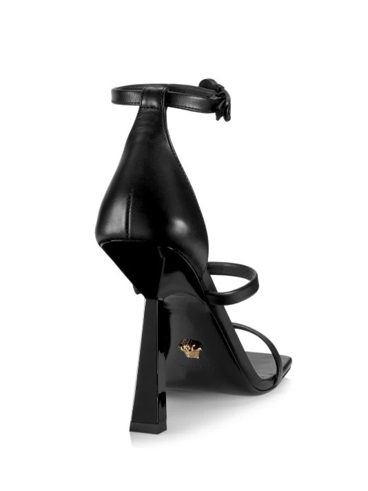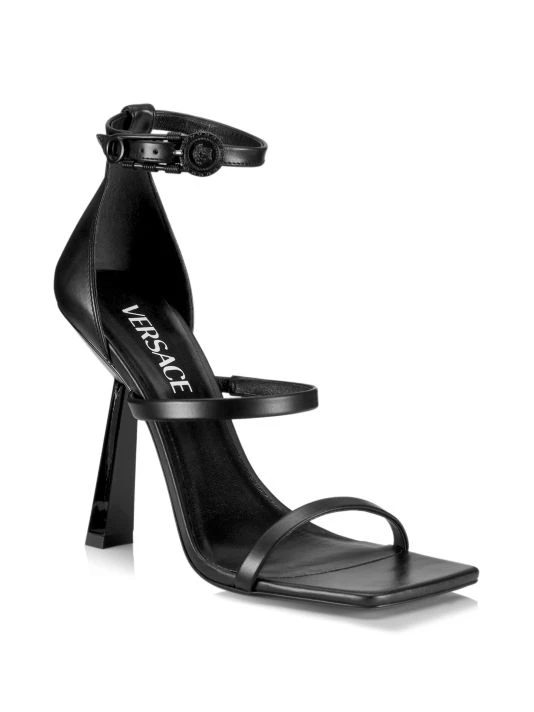 Versace’s 3 Strap sandals are adorned with the signature Medusa safety pin at the dainty ankle strap. Enhanced with a squared toe, this Italian-made pair is anchored by a slanted stiletto heel for a sculptural touch.