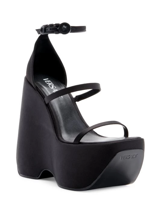 Versace’s 3 Strap sandals are adorned with the signature Medusa safety pin at the dainty ankle strap. Enhanced with a squared toe, this Italian-made pair is anchored by a striking wedge heel and platform.