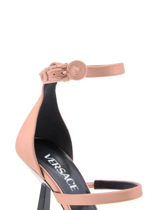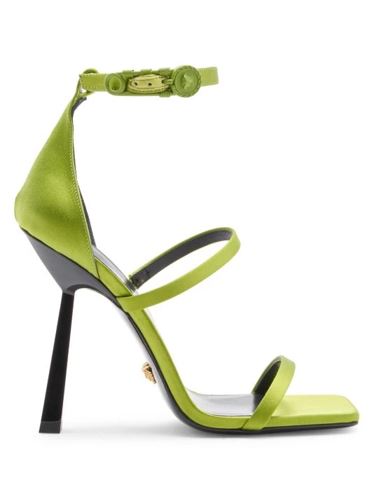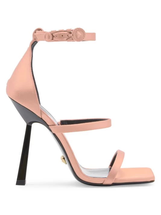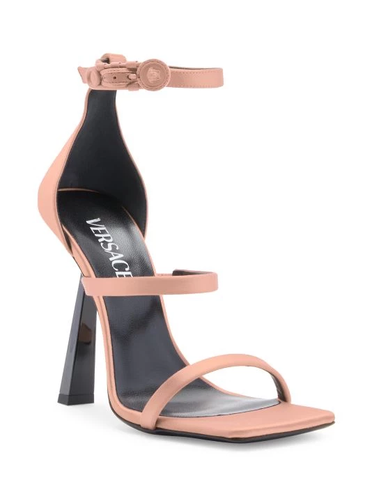 Versace’s 3 Strap sandals are adorned with the signature Medusa safety pin at the dainty ankle strap. Enhanced with a squared toe, this Italian-made pair is anchored by a slanted stiletto heel for a sculptural touch.