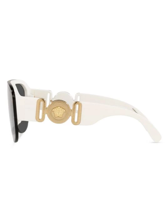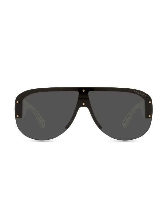 Flaunting a bold pilot silhouette, these statement sunglasses by Versace are finished with iconic goldtone logo-engraved motifs at the temples.