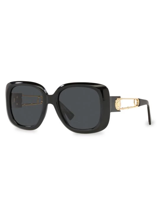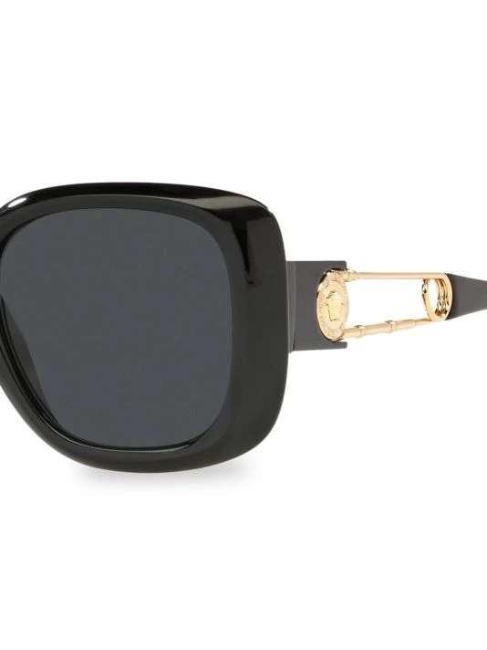Bold square frame define these polished sunglasses, decorated with oversized safety pin temples with Medusa logo.
