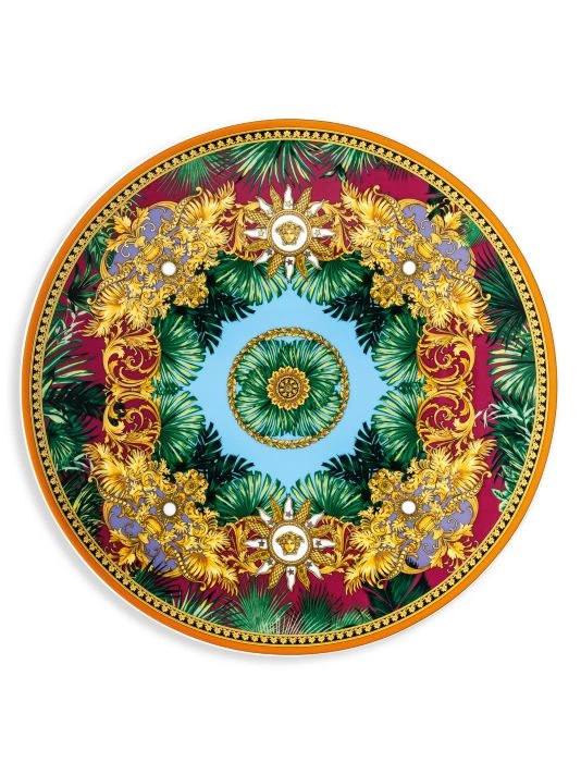 Showcasing eclectic visuals, this porcelain plate is painted with striking tropical and barocco illustrations.