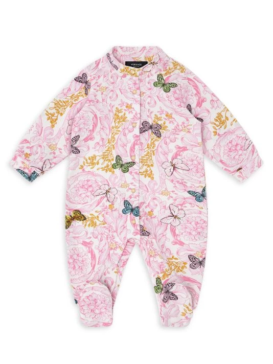 This footed bodysuit features a butterfly print and fastens with snap-front closures.