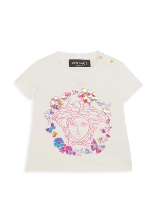 Colorful floral graphics frame a signature Medusa logo on Versace’s stylish cotton T-shirt.
