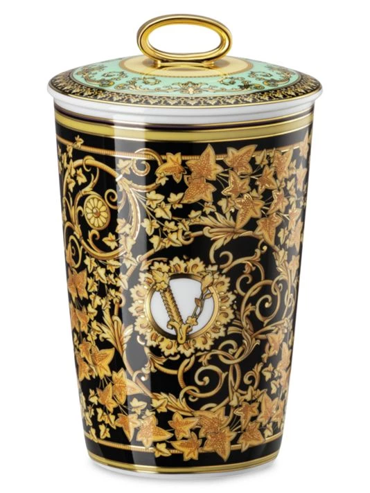 This luxurious Versace candle is housed in a statement porcelain container. It is graced with a signature Barocco pattern with gold-leaf detailing.