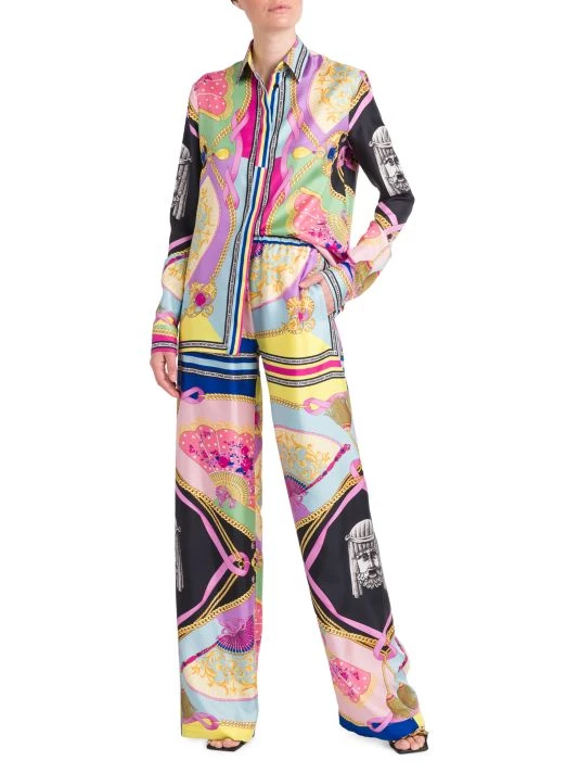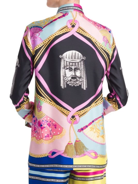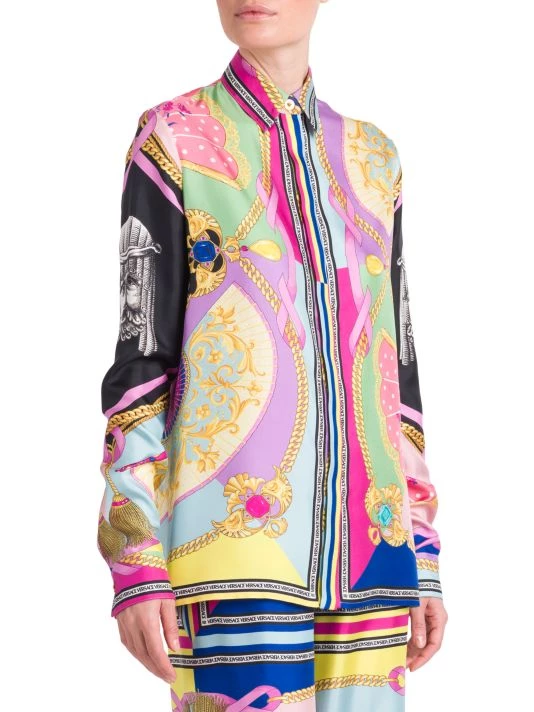Evoking an early 2000s aesthetic, this collection showcases slinky silhouettes pierced with teardrop cut-outs and updated versions of signature Barocco and La Greca prints done in graphic colorways. Crafted of luxurious Italian silk, this tailoredshirt showcases a pigmented Barocco print.
