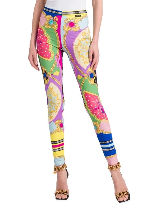 Evoking an early 2000s aesthetic, this collection showcases slinky silhouettes pierced with teardrop cut-outs and updated versions of signature Barocco and La Greca prints done in graphic colorways. These punchy leggings feature Versace’s Barocco print in a pigmented style.
