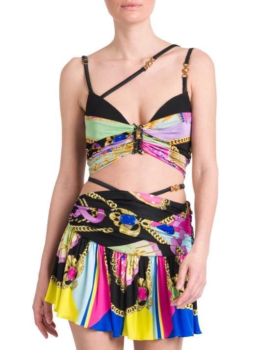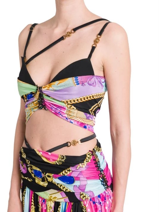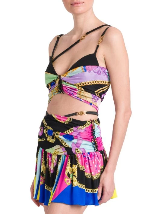 Evoking an early 2000s aesthetic, this collection showcases slinky silhouettes pierced with teardrop cut-outs and updated versions of signature Barocco and La Greca prints done in graphic colorways. This strappy bra top brightens with Barocco print, ruched at the zippered front.