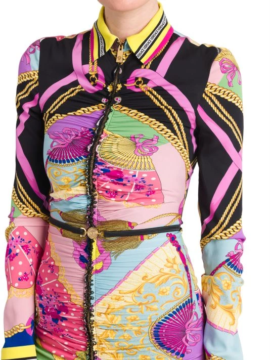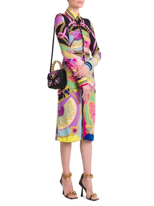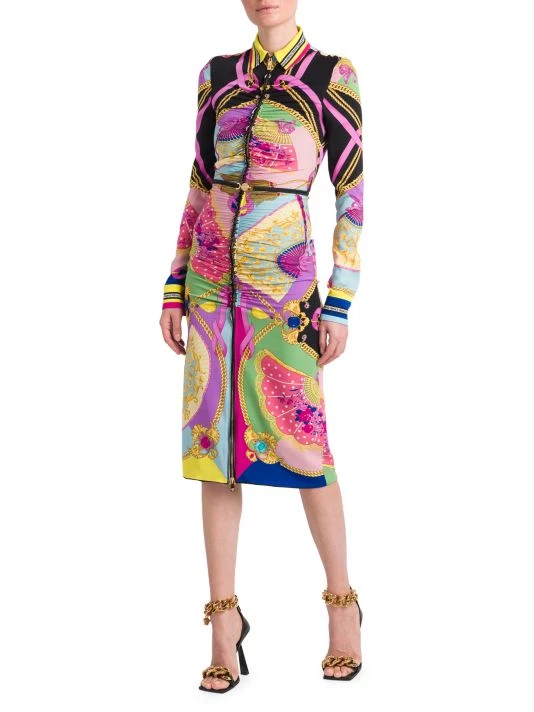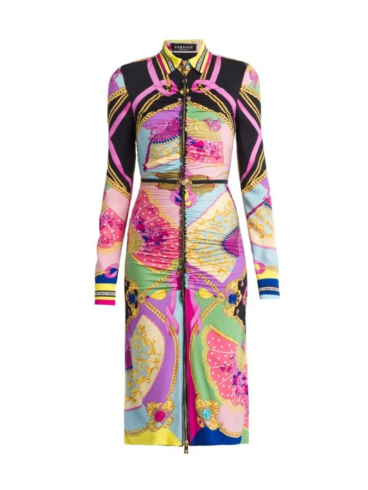 Evoking an early 2000s aesthetic, this collection showcases slinky silhouettes pierced with teardrop cut-outs and updated versions of signature Barocco and La Greca prints done in graphic colorways. This vivacious shirtdress brightens with the Barocco print, enhanced by a chic zippered front design.