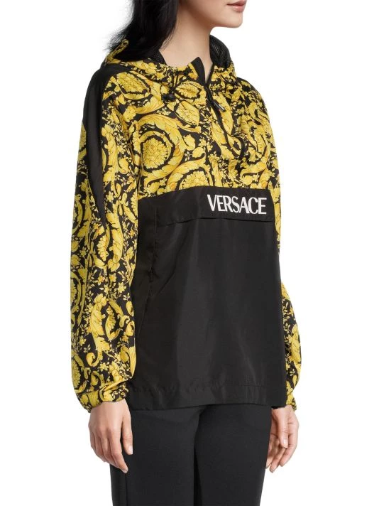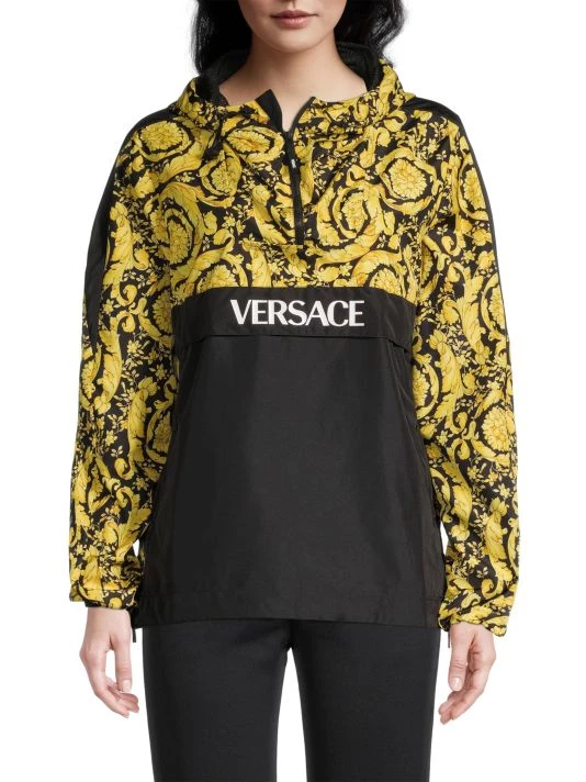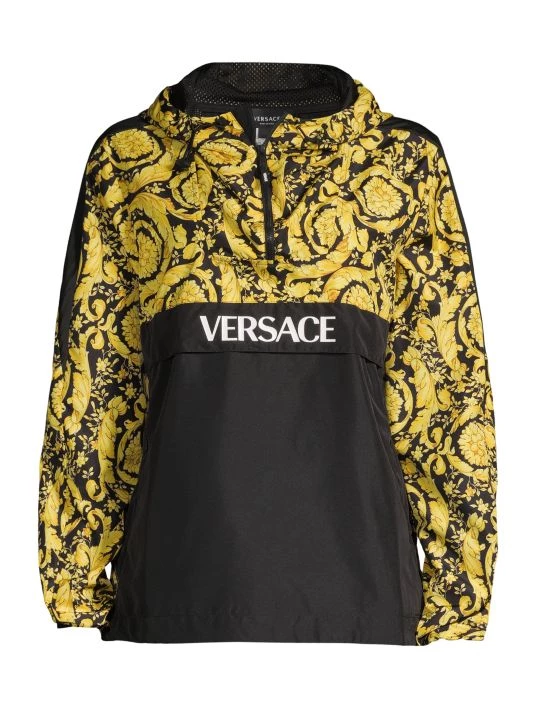 Versace’s hooded half-zip sweatshirt is crafted of nylon shell. The signature Barocco print contrasts the solid black panels featuring the label’s namesake at the center front with concealed slit pockets at the sides.