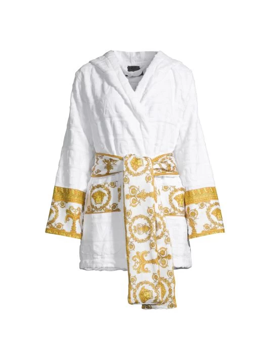 Decadent in a mixed barocco and logo design, this cotton terry robe exudes glamour and opulence.
