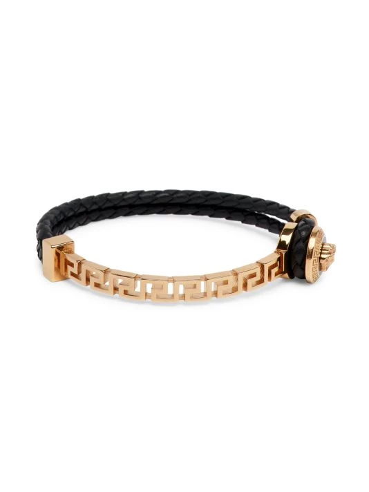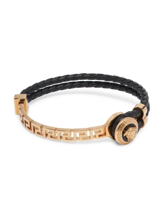This interesting bracelet features a braided leather and geometric brass design. The button-loop closure is adorned with Versace’s signature Medusa head motif.