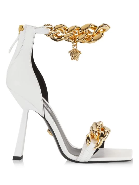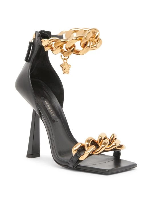Glossy gold chains lend statement style to these high-heel sandals, embellished with a petite Medusa charm.