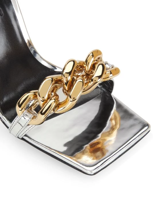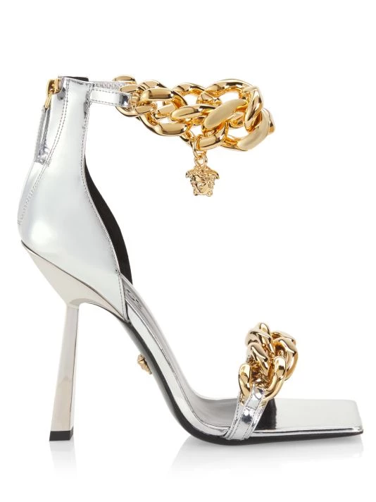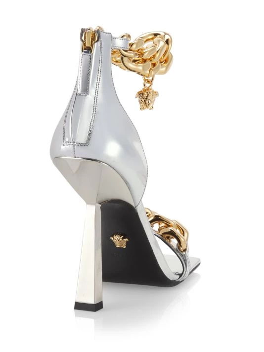 These Versace sandals are designed with chunky polished chains adorned with the signature Medusa head charm. Elevated by a slanted heel, this statement pair is crafted of gleaming metallic leather in Italy.