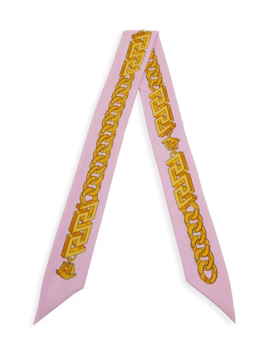 Versace’s signature chain print makes an appearance on this twilly, crafted of fine silk.