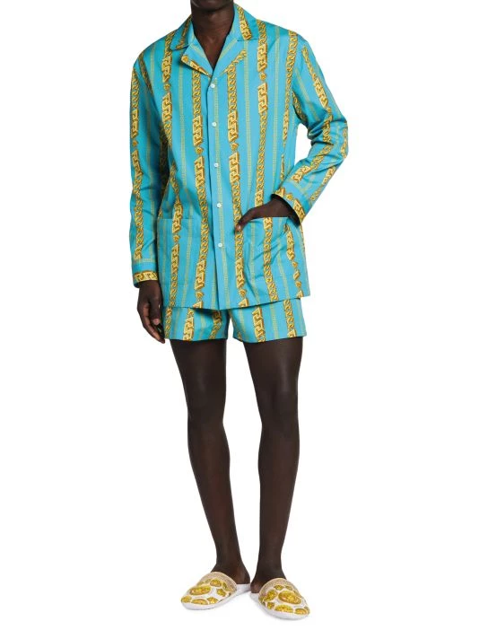 This cotton poplin pajama shirt is printed with a vibrant chainlink Greca pattern.