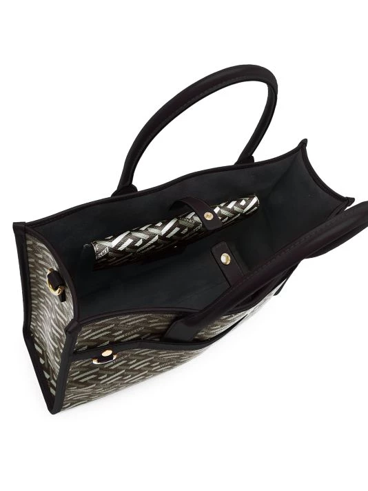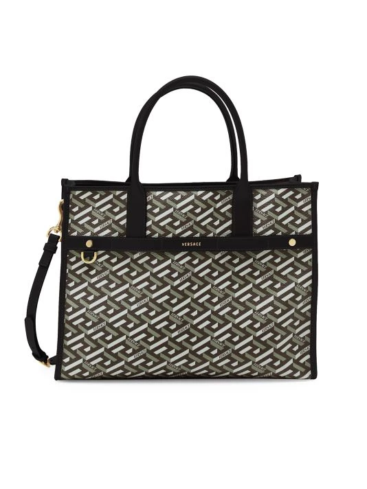 Crafted of signature Greca printed coated canvas with a smooth leather trim, this tote features dual top handles and a removable shoulder strap for versatile wear.