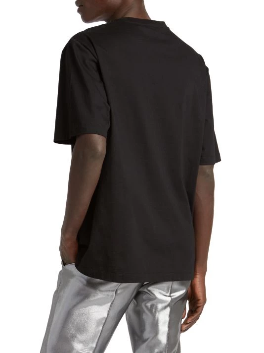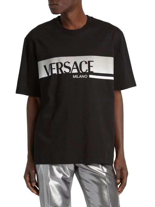 Crafted of cotton, this crewneck T-shirt is printed with a silvertone Versace logo across the chest.