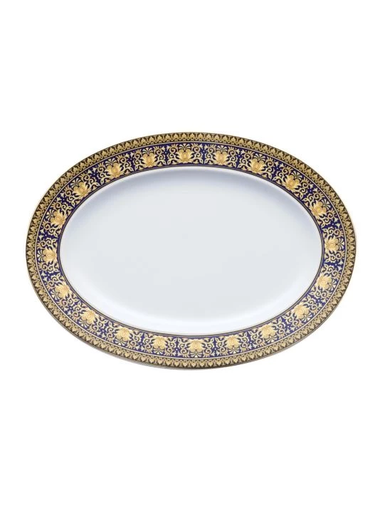 Add elegance to your dinner setting with this classic platter featuring bold staple embellishment on the rim.