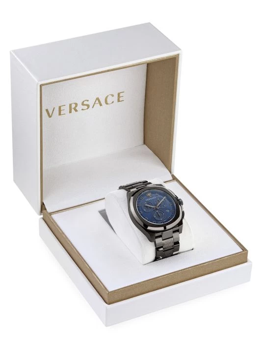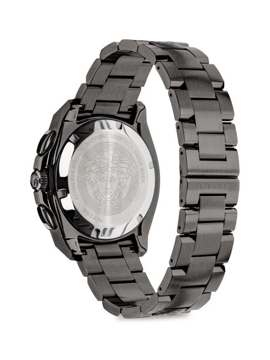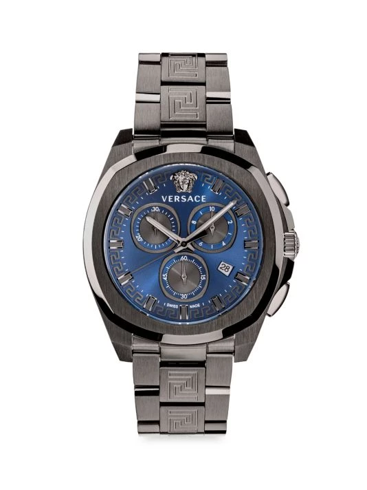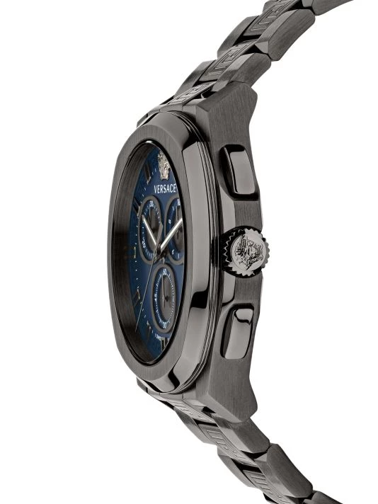 From the Versace Geo Chrono Collection. A new timepiece with a strong masculine allure is Versace Geo. A contemporary iconic style is born thanks to the use of the Greek key embossed on the strap and its geometric cut case. The watch offers a sophisticated dial with attentive Greek key details that leaves its trace to characterize the watch.
