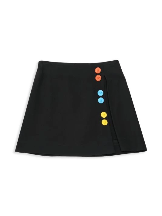 This beautiful satin skirt by Versace features signature colorful button details at the side slit.