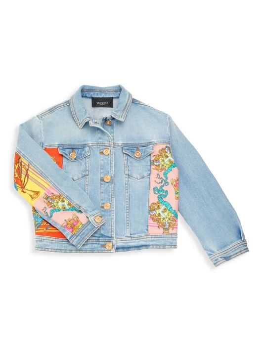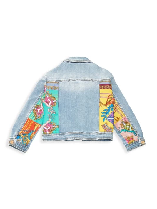 This denim jacket is adorned with exciting fabric side panels featuring intricate signature Versace prints.