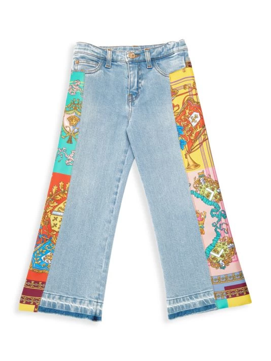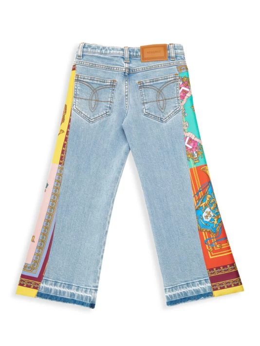 These jeans are adorned with exciting fabric side panels featuring intricate signature Versace prints.