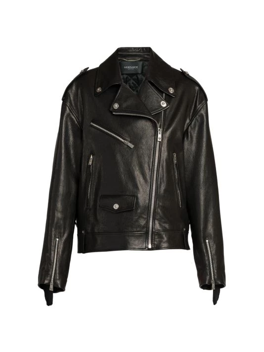 Crafted of goat leather, Versace’s asymmetric moto jacket is elevated by brand-embossed button closures and adjustable buckles at the sides.