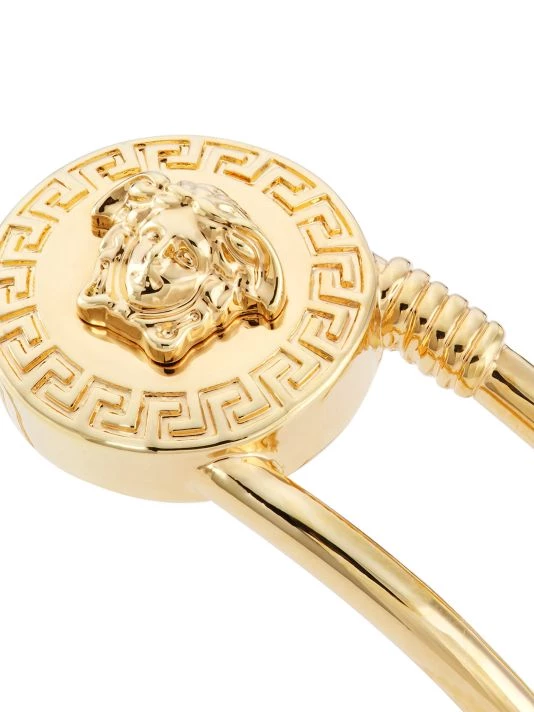 Versace’s goldtone hinged cuff is sculpted in the shape of a safety pin. Made in Italy, this chic piece is accented with the label’s iconic Medusa-head motif and Greca pattern.