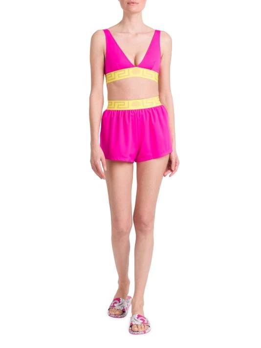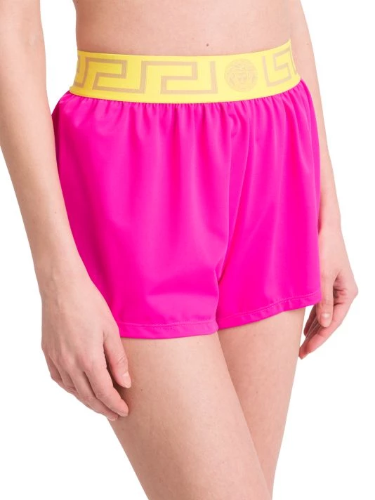 Versace’s swim shorts are crafted of a nylon blend with a Greca logo waistband.
