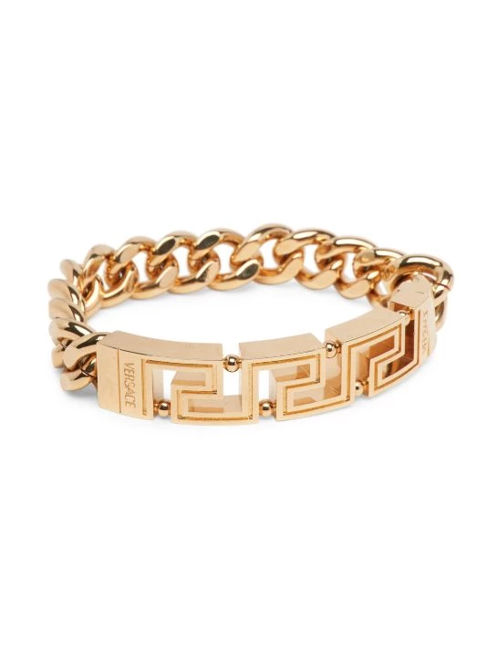 This goldtone chain bracelet features a Greca pattern link with an engraved logo.
