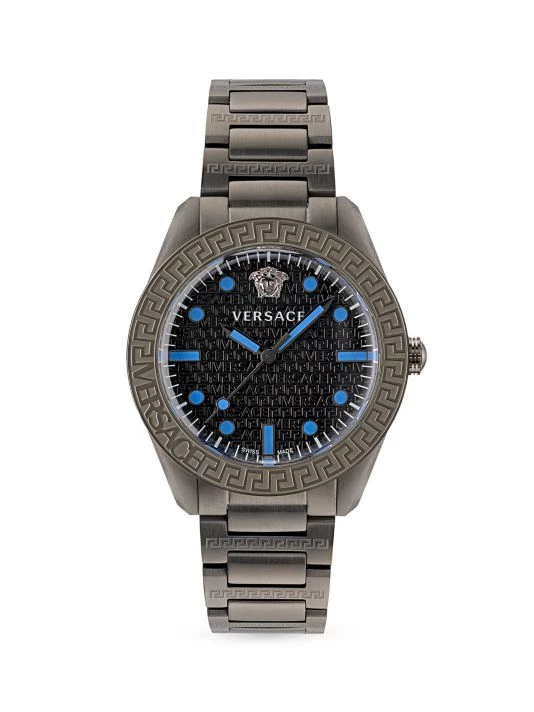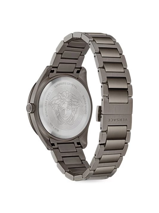 This iconic watch has an incredible and innovative design, characterized by a dome-shaped glass and a bold top ring with Versace lettering and Greca finishing. The dial features three-hand movements, bold indexes to give a strong personality, a Versace logo pattern to celebrate the brand, and the Medusa head motif at 12 hours.