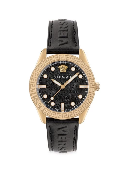 This iconic watch has an incredible and innovative design, characterized by a dome-shaped glass and a bold top ring with Versace lettering and Greca finishing. The dial features three-hand movements, bold indexes to give a strong personality, a Versace logo pattern to celebrate the brand, and the Medusa head motif at 12 hours.