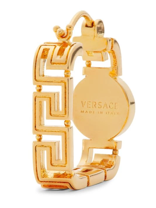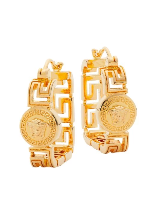 Sculpted in the shape of the label’s iconic Greca pattern, Versace’s square hoop earrings are crafted of goldtone metal and accented with a Medusa-head medallion.