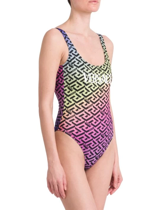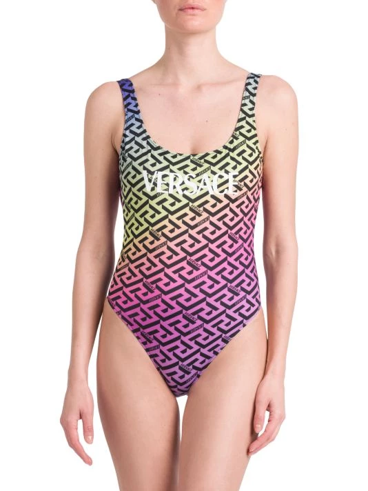Versace’s one-piece swimsuit is adorned with a multicolored logo print.