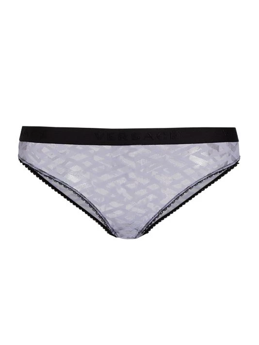 Crafted from lightweight tulle, these bikini briefs feature Versace’s signature La Greca motif and a wide waistband with logo lettering. This delicate design is finished with subtle lace trim.