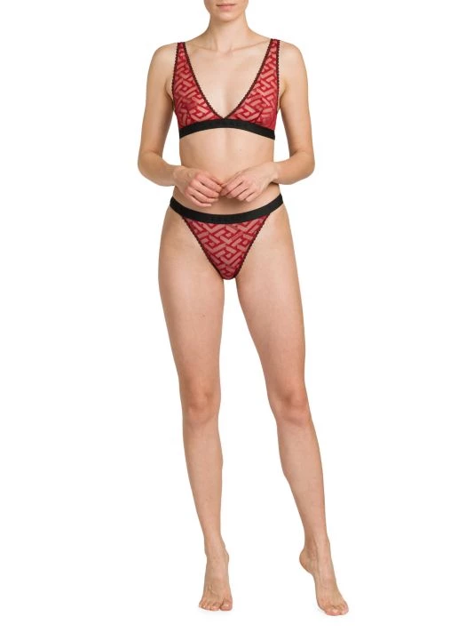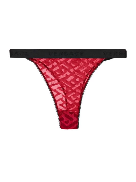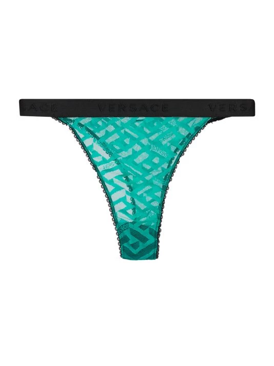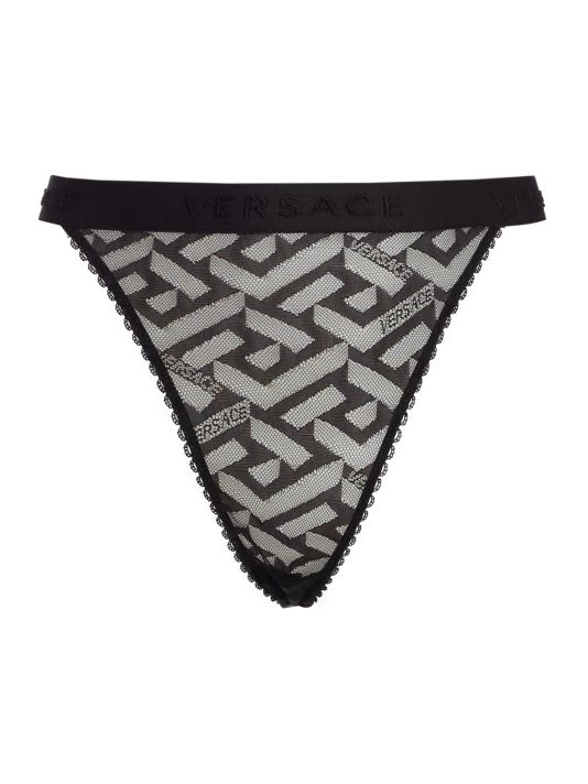 Showcasing the label’s monogram logo, Versace’s thong is crafted of tulle.