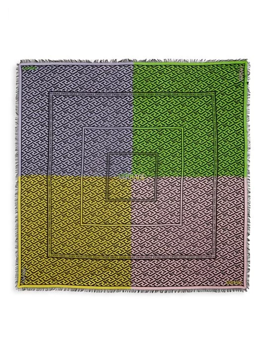 Finished with raw edges, Versace’s wool and silk shawl feature the label’s signature Greca print in a colorblocked pattern.