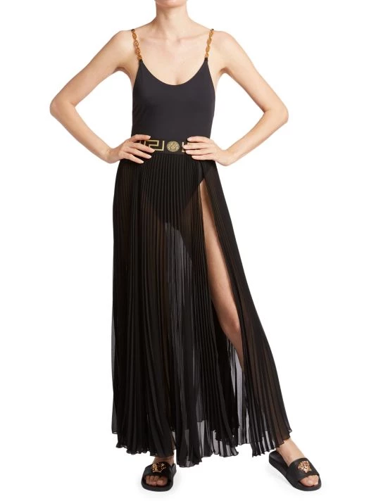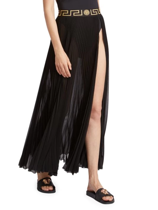 Pleated chiffon cascades from signature Grecco print waist on this maxi-length skirt, set with a side slit for ease of movement and a touch of skin.