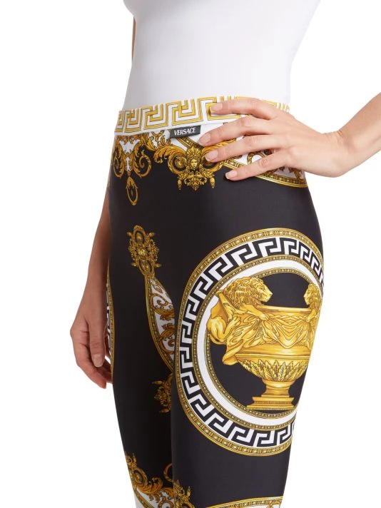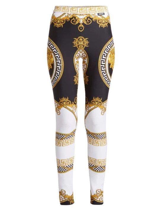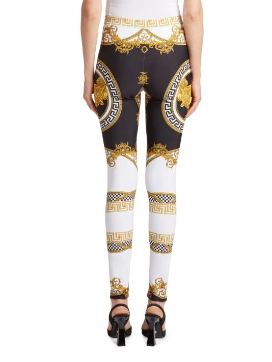 Fitted mid-rise leggings boast iconic heritage print, featuring medusa and filigree designs signature to the brand.