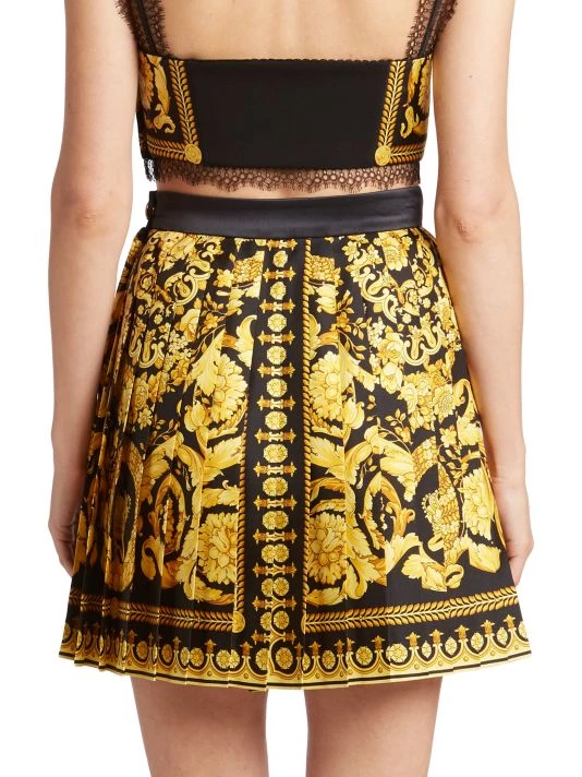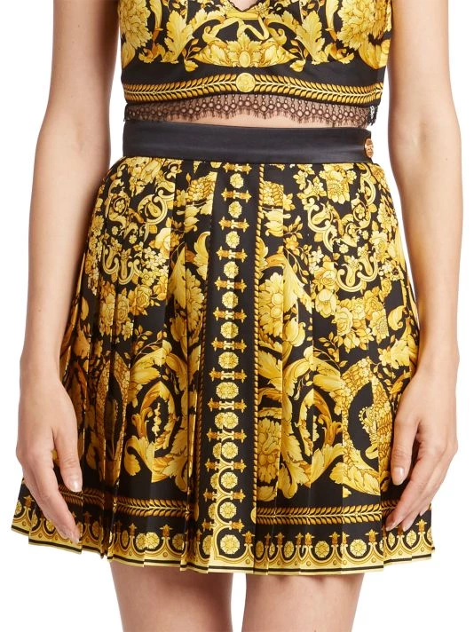 Crafted of luxurious Italian silk, this mini skirt fits at the waist finished in sharp box pleats with bright designer print.