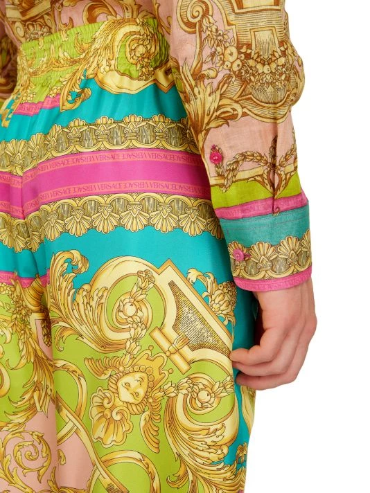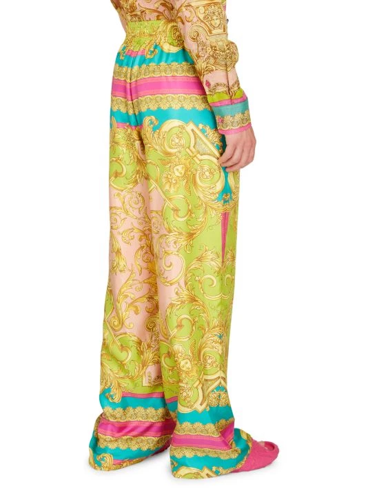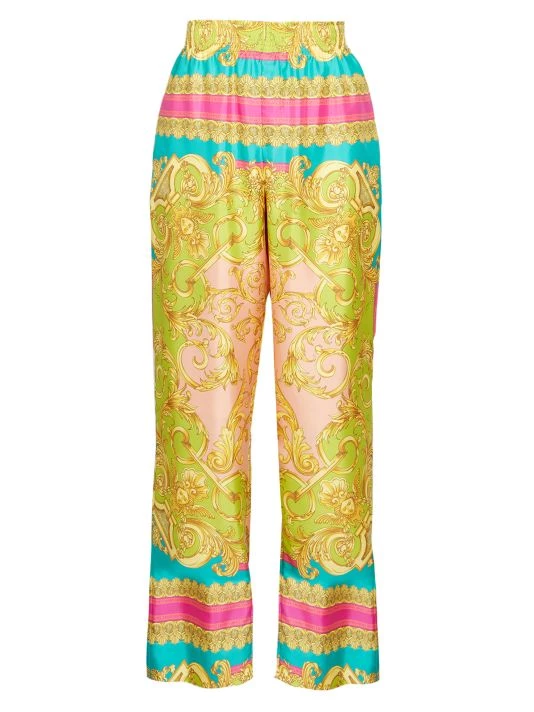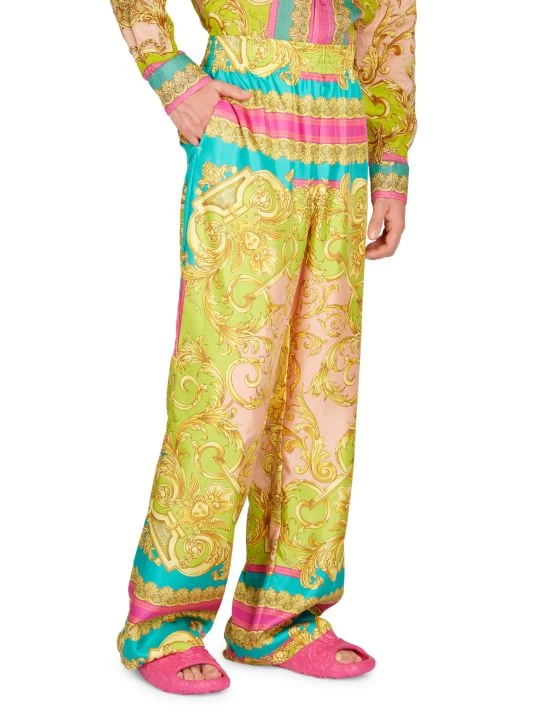 For this season, Donatella Versace blended the house’s quintessentially Italian luxe tailoring with a Gen Z edge. The Artistic Director’s use of the label’s Medusa logo, La Greca print, and signature oversized safety pins were updated with a bold color palette and playful silhouettes. Crafted of smooth silk, these lounge pants showcase a vibrant Rococo print finished with a subtle logo trim.