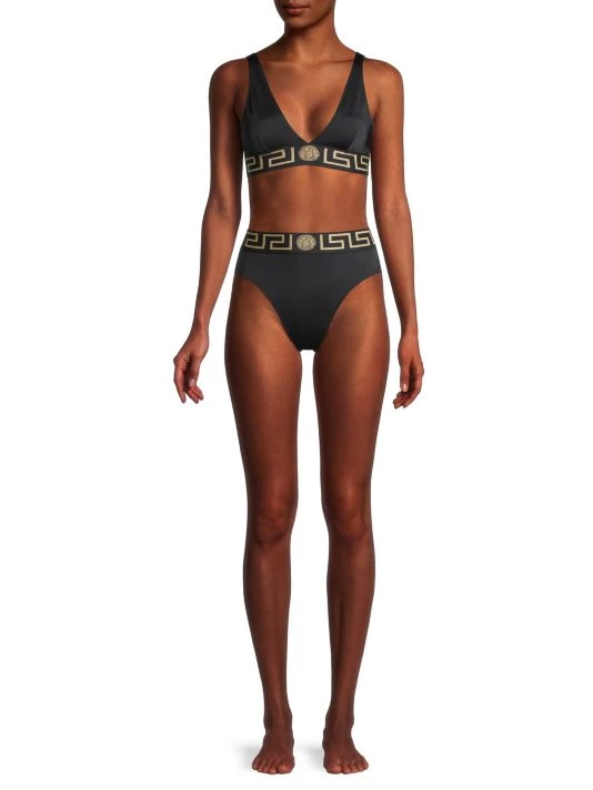 Retro-inspired high-rise bikini Bottom with a logo band waist and high cut leg.
