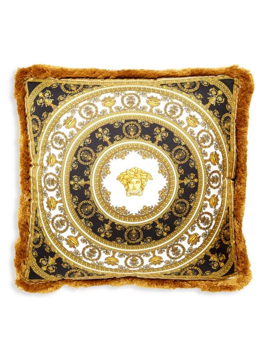Crafted of luxurious silk, this intricate square cushion is adorned with Versace’s beautiful I Heart Baroque signature pattern. The opulent design includes the label’s Medusa head motif and Italian accents and is finished with cotton fringe on all sides.