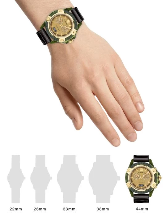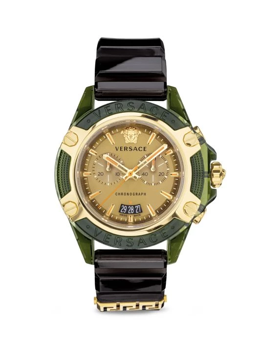 This chronograph watch is enhanced with distinctive brand features like the Medusa head and Greca motif.