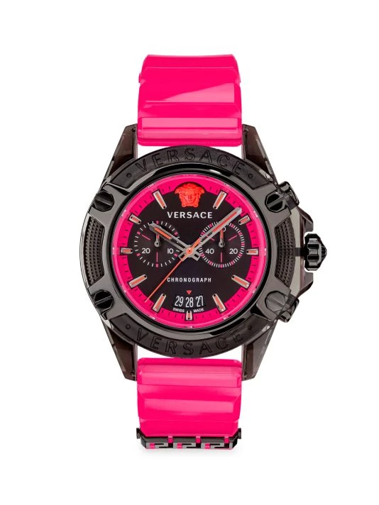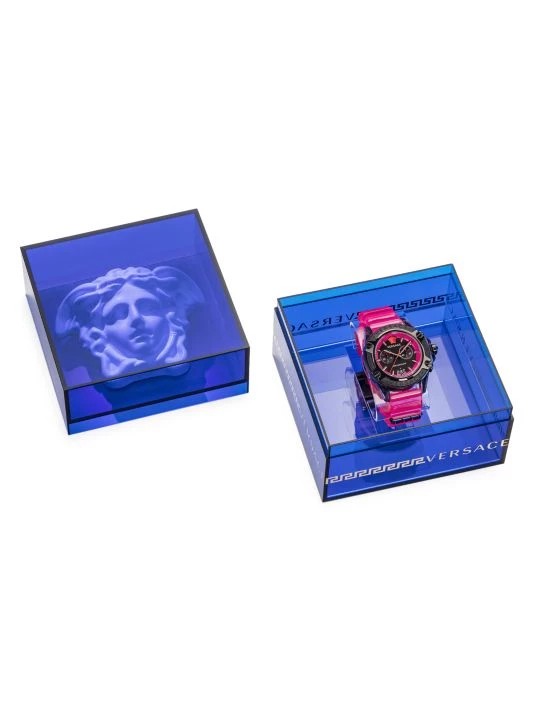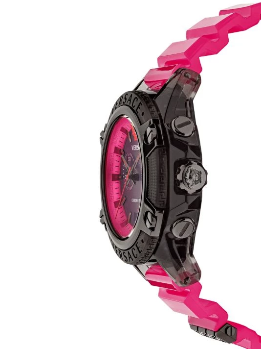 From the Icon Active Collection. The Icon Active conveys an urban and sporty look with its transparency and color. Absolutely and exquisitely iconic, design elements include the metal loop on the strap that recalls the Greek key, a Medusa at 12h and an internal Greek key. From the curvature of the inner dial ring.