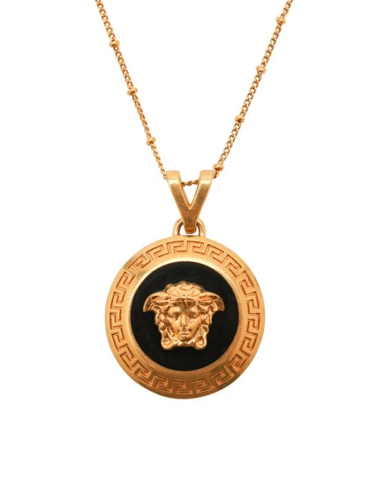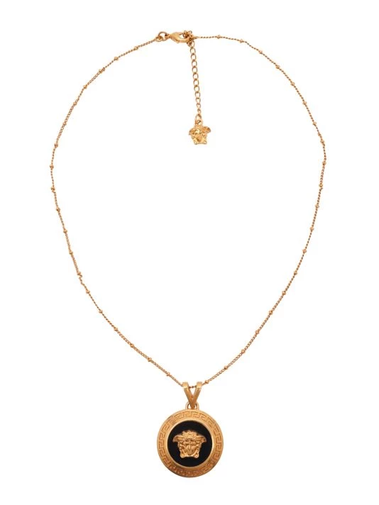 From the Icon Collection. Signature carved Medusa pendant in a striking black enamel and goldtone setting on a beaded chain necklace.