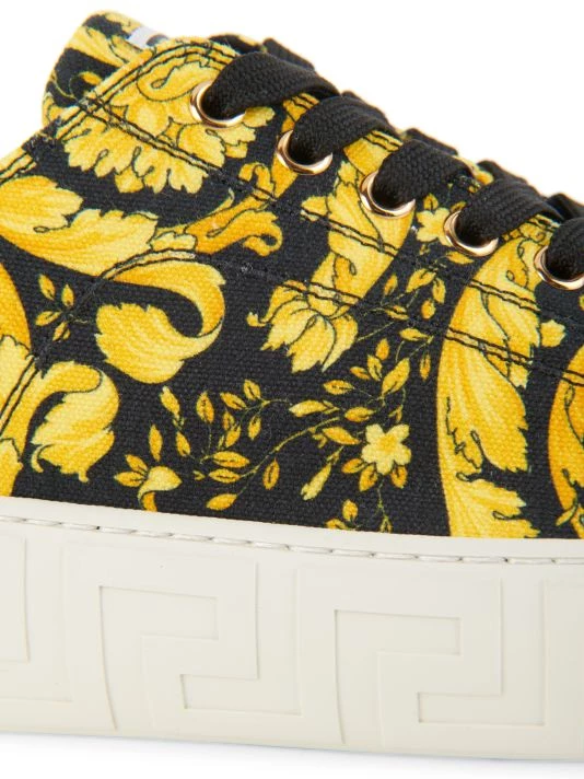 Set atop a platform Greca sole, these canvas low-tops are adorned with Versace’s signature filigree motif.