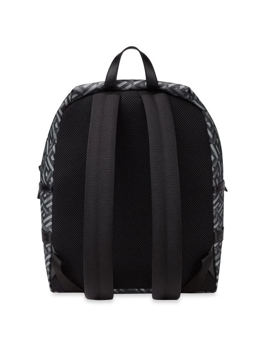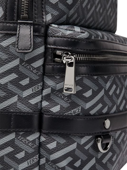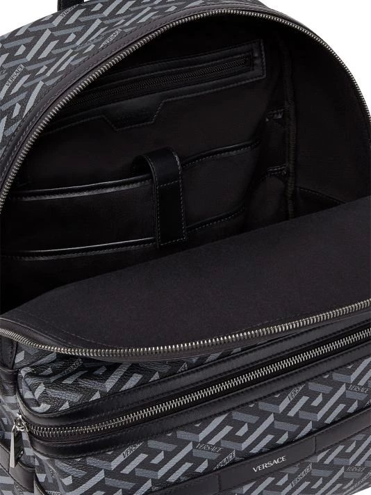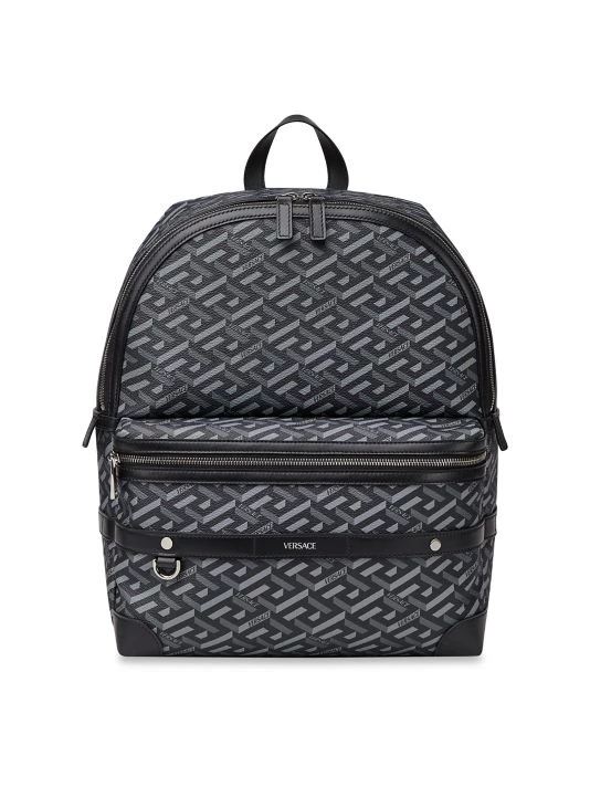 From the La Greca Signature collection. This leather backpack features the brand’s monogram print, sports a front zippered pocket, and fastens with a top zipper.