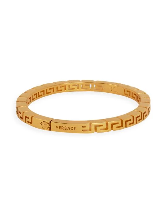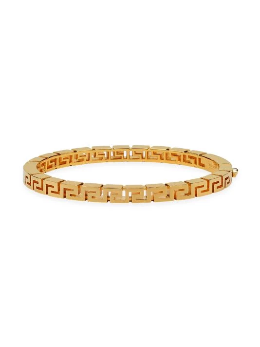 Engraved with the Versace brand name, this goldtone metal bracelet flaunts the iconic La Greca motif with a Medusa head appliqué.